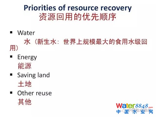 資源回收的優(yōu)先順序:作為一個(gè)很小的缺乏天然資源的城市國(guó)家,新加坡把資源回收作為放在很重要的地位,像大家知道由于天然的水資源的短缺,水的回收放在第一位,現(xiàn)有的150萬(wàn)噸的污水處理,一半以上的出水用雙模技術(shù)生產(chǎn)新生水。而到2025年的時(shí)候,除初期雨水外,其余的出水做飲用水級(jí)的再應(yīng)用。