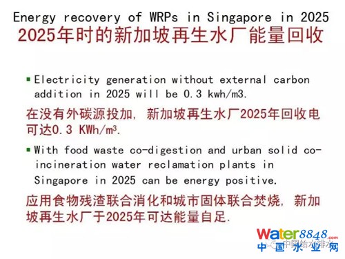 到2025年的時(shí)候,新加坡再生水廠的能源回收在沒(méi)有外加碳源的情況下可以達(dá)到0.3千瓦時(shí)每立方米污水。應(yīng)用食物殘?jiān)统鞘泄腆w廢棄物的協(xié)同焚燒,整個(gè)新加坡污水處理廠包括新生水廠可以達(dá)到能源自給,從而實(shí)現(xiàn)新加坡污水能源回收的第三版。