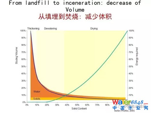 (詳見(jiàn)PPT)這張圖就顯示干化率、污泥體積和能源的需求關(guān)系,新加坡最早是脫水達(dá)到20%含固率以后就進(jìn)行的土地的填埋,但是沒(méi)有多久就填滿(mǎn)填埋場(chǎng)了,所以現(xiàn)在進(jìn)行焚燒處置。據(jù)我所知,在北歐許多國(guó)家焚燒是最后處置方法。當(dāng)然北京、上海最后怎么樣做?我們眼前下結(jié)論還為時(shí)尚早。
