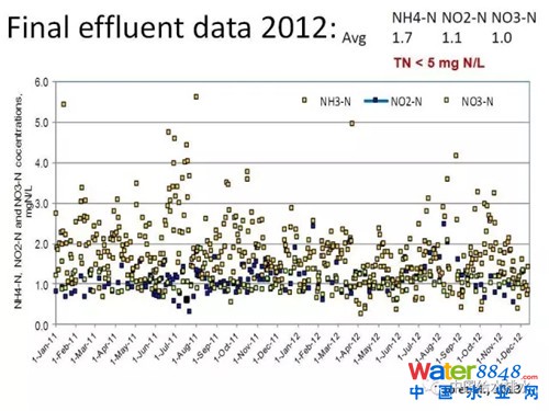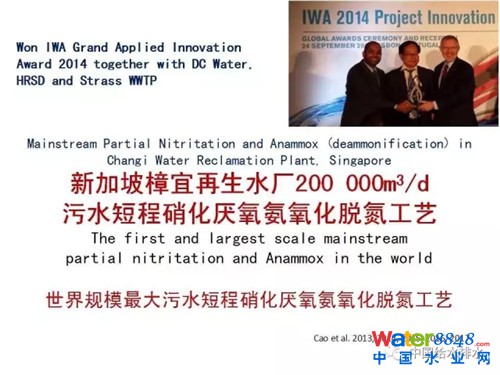 (詳見(jiàn)PPT)目前新加坡樟宜再生水廠,20萬(wàn)噸的主流厭氧消化過(guò)程已經(jīng)報(bào)告了,是世界上最大的部分短程氨氧化和氨厭氧化過(guò)程,并且在2014年,我們跟美國(guó)的兩家水務(wù)系統(tǒng)和Strass廢水處理廠一起贏得了國(guó)際水協(xié)的發(fā)明大獎(jiǎng)。