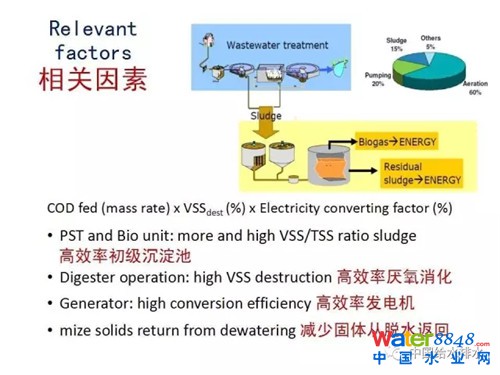 (詳見(jiàn)PPT)這張圖看似很簡(jiǎn)單,今天污水處理廠能源回收主要是應(yīng)用污泥厭氧反應(yīng)器。厭氧反應(yīng)器主要是由初沉池排放的泥和活性污泥池剩余污泥作為“飼料”輸?shù)竭@個(gè)反應(yīng)器里,而產(chǎn)生的生物氣再由發(fā)電機(jī)轉(zhuǎn)化供應(yīng)電源。當(dāng)然,在理論上來(lái)說(shuō),脫水的污泥可以再產(chǎn)生能源,但目前使用還不普遍。所以從現(xiàn)有的污水處理廠產(chǎn)生能源來(lái)看,重要的因素是高效的初沉池和厭氧消化反應(yīng)器、高效的發(fā)電機(jī)。