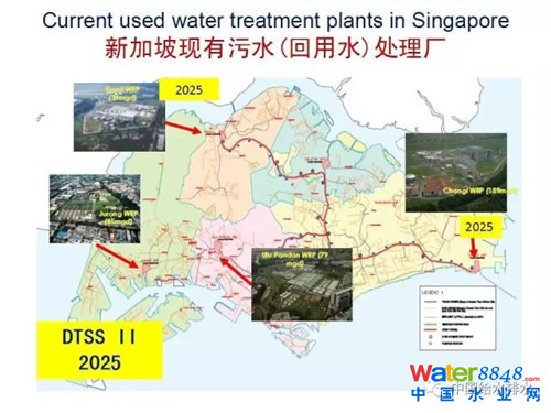 (詳見(jiàn)PPT)新加坡現(xiàn)有4個(gè)污水處理廠,總處理量是160萬(wàn)噸。三個(gè)紅塊稱(chēng)之為第二階段的污水處理廠。這兩個(gè)現(xiàn)有污水處理廠在新廠建成以后就要廢除了,到2025年新加坡會(huì)就有三個(gè)污水處理廠,總處理量到時(shí)候是240萬(wàn)立方米/天。