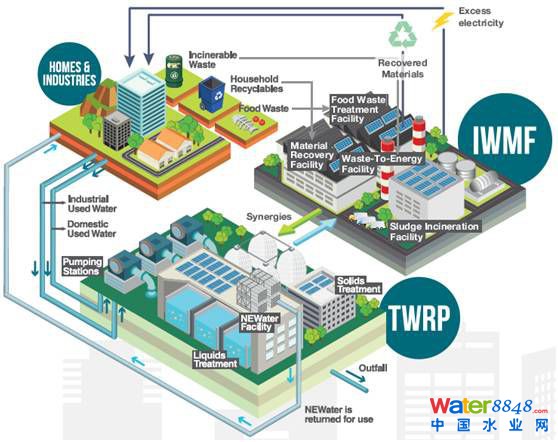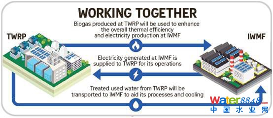 新加坡的水務(wù)機(jī)構(gòu)PUB和國(guó)家環(huán)境局NEA合作推出一項(xiàng)頗具環(huán)境創(chuàng)造力的環(huán)保工程規(guī)劃,使再生水廠(Tuas Water Reclamation Plant –TWRP)和垃圾處理廠(Integrated Waste Management Facility -IWMF)協(xié)同合作,實(shí)現(xiàn)水-能源-廢棄物的循環(huán)。IWMF和TWRP將在各自的固體廢棄物處理和污水處理過程中最大限度地實(shí)現(xiàn)能源和資源回收。
