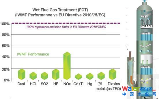 IWMF設(shè)計(jì)有先進(jìn)的濕煙氣處理(FGT)系統(tǒng),洗滌塔(高度≈30米),酸性氣體在濕式洗滌器中被中和,飛灰在上游被捕獲,以確保最清潔的空氣排放。跟歐盟工業(yè)排放指令EU Directive 2010/75/EC 的指標(biāo)要求對(duì)照來看,空氣污染物排放優(yōu)勢(shì)非常明顯。