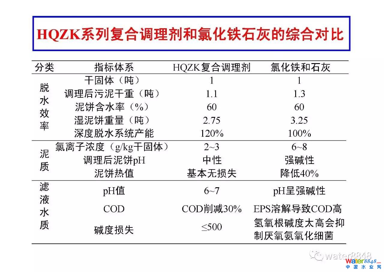 來(lái)看一下復(fù)合調(diào)理和石灰鐵的綜合對(duì)比。都以一噸來(lái)算,復(fù)合調(diào)理之后干重,因?yàn)橛幸粋(gè)投配率增加到1.1,氯化鐵石灰達(dá)到1.3噸。泥餅60,濕泥餅2.75,深度脫水系統(tǒng)產(chǎn)能達(dá)到20%,F(xiàn)在控制在PH值在7.5左右,氯化鐵和石灰是強(qiáng)堿性。濾液可以削減30%左右,采用復(fù)合調(diào)理之后,盡量少損失一些。