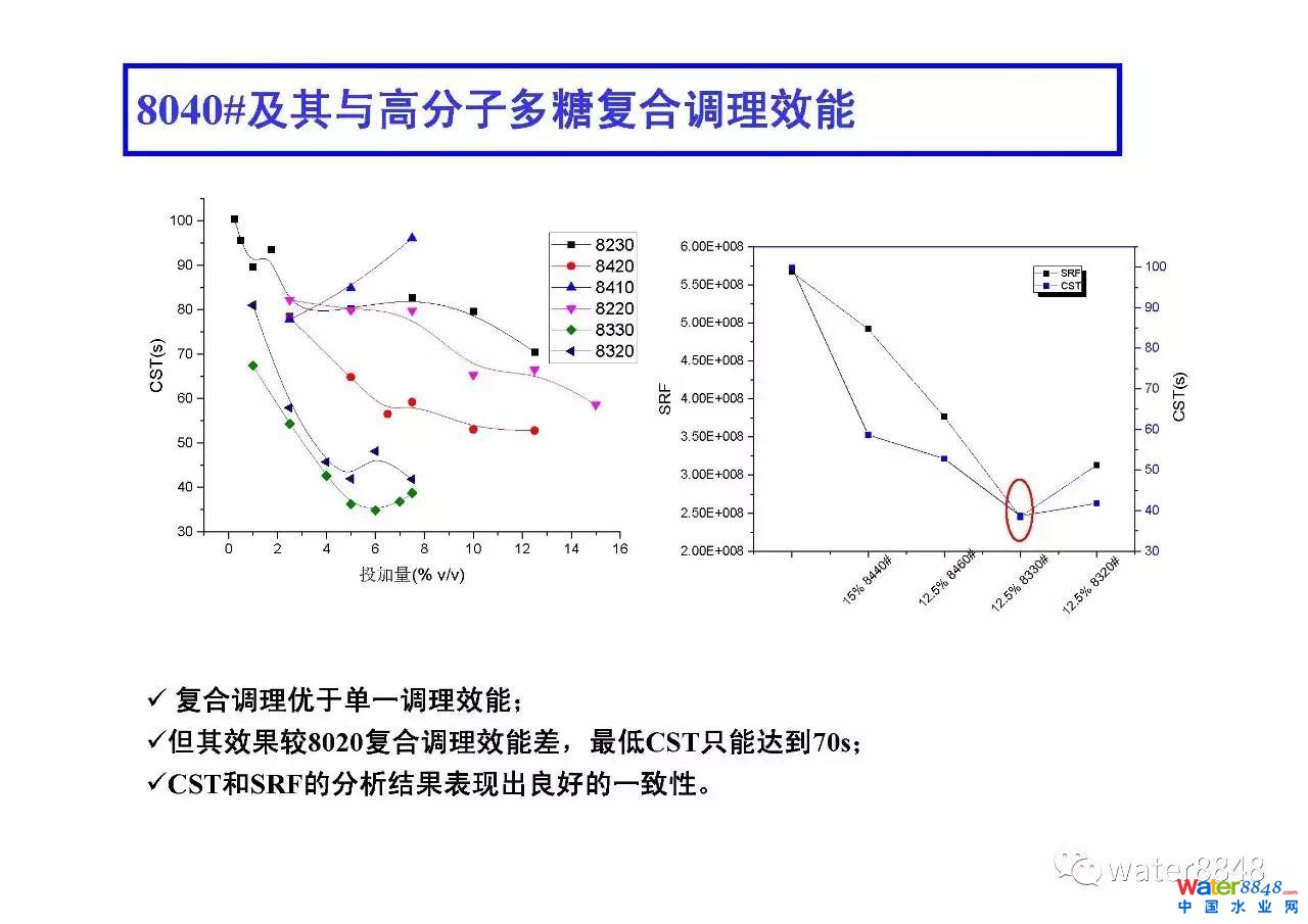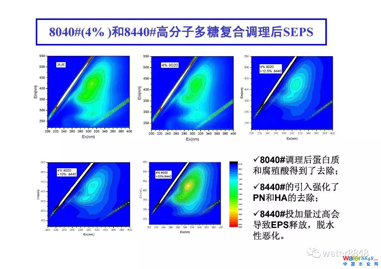 另外我們針對(duì)消化污泥,我們做的一些藥劑的選擇。我們發(fā)現(xiàn)不同的藥劑,它對(duì)CST值,調(diào)理有兩個(gè)參數(shù),一個(gè)是CST值和SRF。這兩個(gè)參數(shù)都很好反映的污泥的可濾性。那么對(duì)不同的藥劑篩選之后,我們發(fā)現(xiàn)單一的藥劑只能脫到含水率70%左右就已經(jīng),就是CST值達(dá)70很難下去了。后來(lái)我們采用了復(fù)合調(diào)理方式可以達(dá)到降到含水率40%左右,采用SRF的評(píng)價(jià)都可以做的很好。進(jìn)一步考察兩種藥劑復(fù)配之后進(jìn)行的調(diào)理,不同的投配率,絮體成長(zhǎng)型非常好,顆粒得到快速的增長(zhǎng),熱水解之后的另一個(gè)特征就泥越來(lái)越細(xì),實(shí)際上進(jìn)行高壓煮熟,都解體了。另外從熒光圖譜看到調(diào)理之后有機(jī)物組成的情況,這是熱水解的消化后的泥主要是含有蛋白質(zhì)和腐植酸之類(lèi)的,單一的調(diào)理,去掉一部分,經(jīng)過(guò)復(fù)合調(diào)理得到大量的去除,對(duì)總氮和腐植酸的去除率得到上升。如果過(guò)高導(dǎo)致EPS釋放。這是一個(gè)優(yōu)化的過(guò)程。