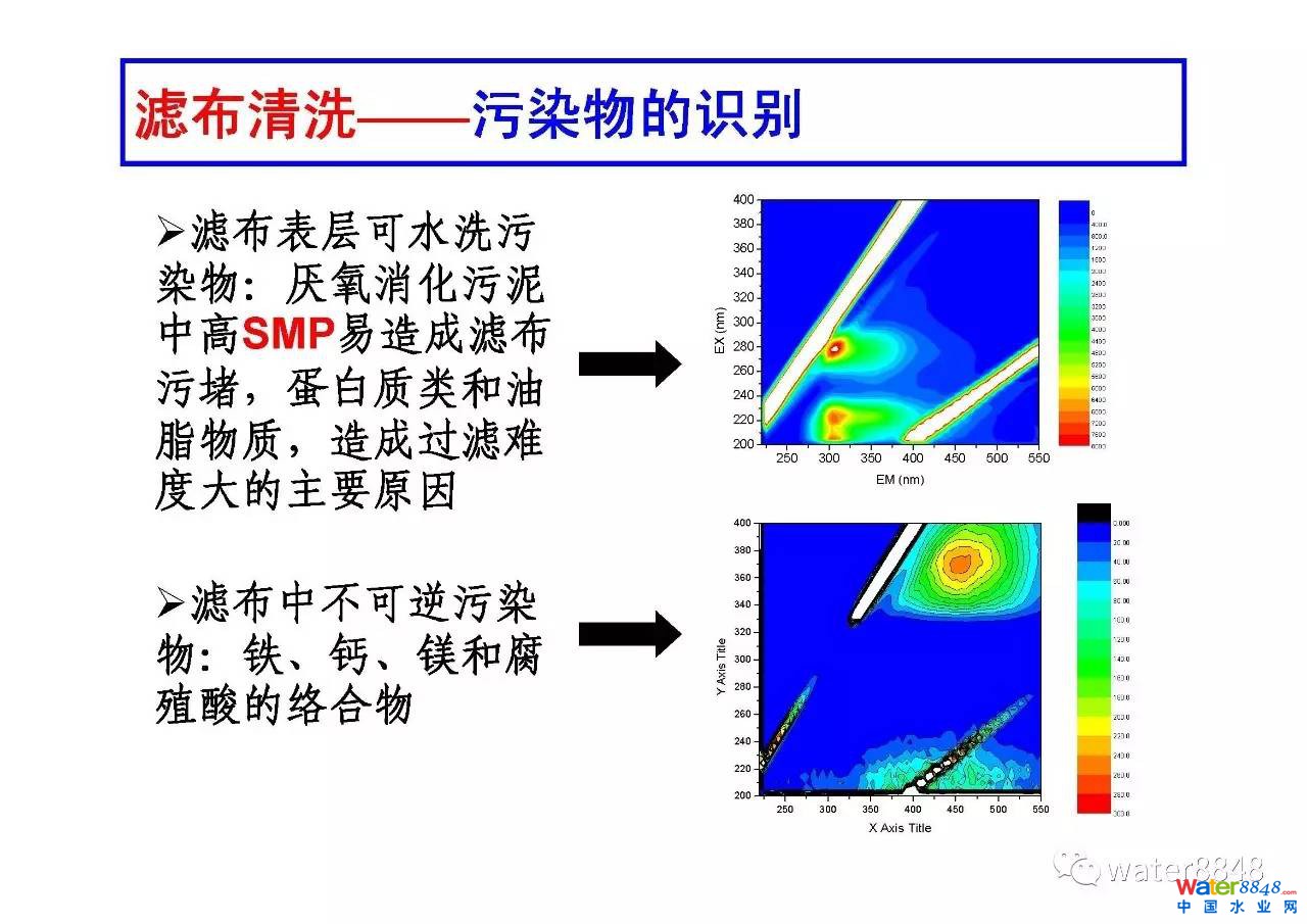 調(diào)理是一個(gè)系統(tǒng)的工程,除了調(diào)理劑的反應(yīng)跟深度脫水的考慮,另外就是濾布,濾布選擇非常的關(guān)鍵,這對(duì)于深度脫水來(lái)說(shuō)是一個(gè)很重要的。另外就是濾布的清洗,我們可以看到一個(gè)是表層的污染物,一個(gè)主要是蛋白質(zhì)污染物的和油脂物質(zhì)。另外有一些不可逆污染在濾布的生成。這是一些表觀的一些濾布的污染,經(jīng)過(guò)化學(xué)清洗可以很好的恢復(fù)。我們跟北排成立了公關(guān)小組對(duì)清洗的濾布也做了一些工作。