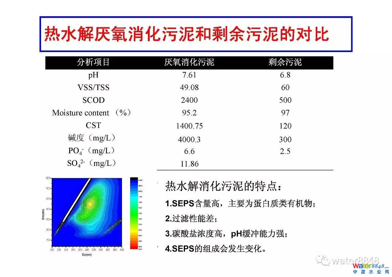 熱水解的營(yíng)養(yǎng)消化的污泥和剩余污泥來(lái)做一個(gè)對(duì)比,PH值,厭氧消化PH值達(dá)到7.6,堿性,剩余的污泥是弱酸性。另外這是有機(jī)質(zhì)的含量,當(dāng)然它這個(gè)污泥有機(jī)質(zhì)含量降低了一些,北京的泥有機(jī)分的含量非常之高,冬天的時(shí)候可以達(dá)到60-80。另外一個(gè)很重要的特點(diǎn)就是剛才很多都提,前面的提高都提到了,SCOD含量大幅度的上升,這樣對(duì)我們污泥的調(diào)理帶來(lái)嚴(yán)重的挑戰(zhàn),污泥調(diào)理劑藥劑投加量大幅度的上升,如何解決這個(gè)難題,后面會(huì)提到。另外污泥的含量,顆粒物的含量是大幅度上升,比我們一般性的污泥是在97-98%。湖南是可以達(dá)到91%,這樣我們?cè)谡{(diào)理過(guò)程污泥最佳的一個(gè)含固率要做一些調(diào)整?梢钥吹轿覀冏鲱}解CST值非常高,這是一個(gè)特點(diǎn)。總體來(lái)說(shuō)SEPS含量高,主要是蛋白質(zhì)類(lèi),過(guò)濾性能比較差,碳酸鹽濃度高,PH緩沖能力比較強(qiáng),熱水解之后,蛋白質(zhì)的含量上升了,從上面的熒光圖可以看到,SEPS組成會(huì)發(fā)生變化。