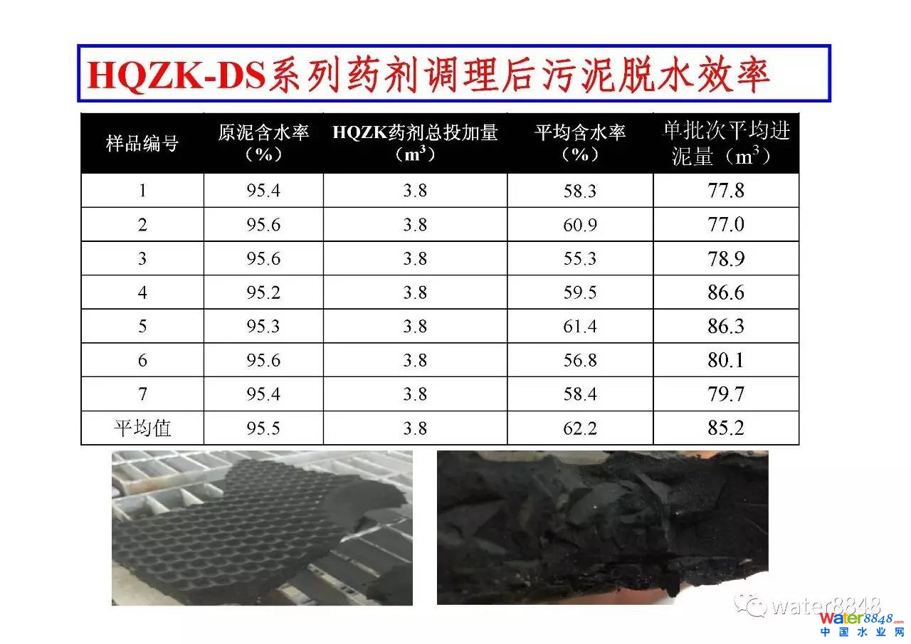 再看實(shí)際運(yùn)行的情況,這是小紅門(mén)水廠(chǎng)的調(diào)理系統(tǒng),總共是一個(gè)8組240立方的調(diào)理池,這個(gè)調(diào)理池在設(shè)計(jì)的時(shí)候偏大了一點(diǎn)。壓濾機(jī)是800平米隔膜壓濾機(jī),設(shè)計(jì)產(chǎn)能是180噸干泥,后來(lái)選擇了兩種復(fù)合藥劑進(jìn)行了一個(gè)實(shí)驗(yàn)。我們看采用的原泥含水率是在95%左右,投加量固定,最后脫水污泥含水率在58%-60%之間。進(jìn)泥量在80。由于原泥的含固率增加,因?yàn)槭鞘S辔勰嗟暮恳话闶?span style="border: 0px; margin: 0px; padding: 0px;">97、98,進(jìn)泥量在80多,雖然減少了,但是處理率還是增加了。這是三個(gè)多月前的結(jié)果,剩余污泥跟熱水解消化污泥復(fù)配的泥,目前含水率降到55%左右。