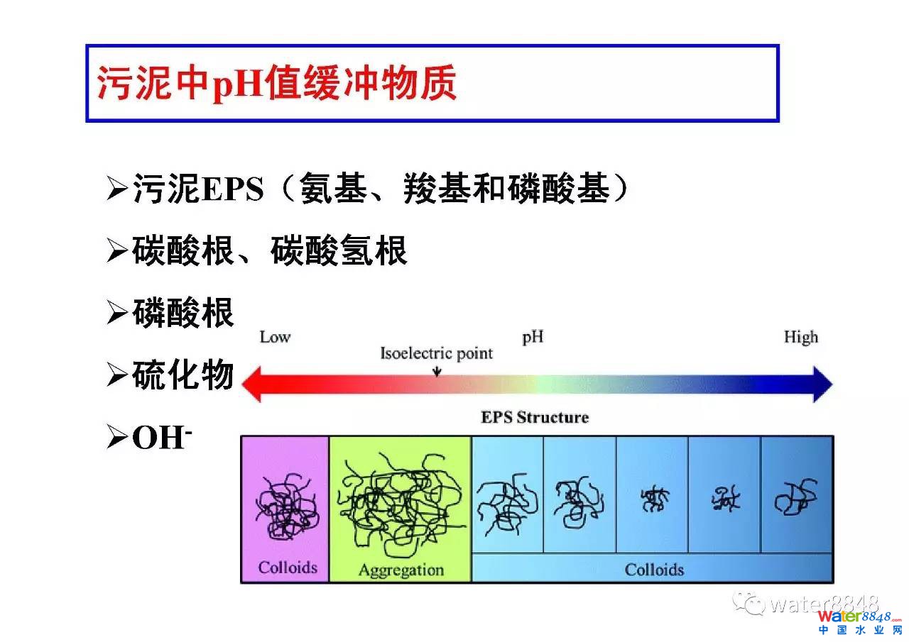 進(jìn)一步看一下污泥中的調(diào)理有哪些問(wèn)題。首先是EPS物質(zhì),就是它有一定的酸堿的緩沖的作用。另外就是產(chǎn)生了大量的碳酸根、碳酸氫根,這些物質(zhì)如何在調(diào)理過(guò)程中,不把它消化掉,還有磷酸根,另外硫化物,如果硫化條件下變成硫化氫是惡臭氣體。這是污泥中的這么一些比較復(fù)雜的一些成份。熱水解之后,我們說(shuō)還包含在這里面進(jìn)一步去考慮。最重要的因素就是濾后的水對(duì)后續(xù),因?yàn)槔锩婧幸恍?span style="border: 0px; margin: 0px; padding: 0px;">COD回到污水處理廠(chǎng)之后要進(jìn)行進(jìn)一步的處理,不能影響厭氧氨氧化過(guò)程。這里面紅菌PH值是6-8.5,如果以前小紅門(mén),高碑店的控制的PH值在6左右,所以濾后水偏酸性的話(huà)就影響這個(gè)工藝過(guò)程,就會(huì)影響紅菌的活性,這是必須要注意的。