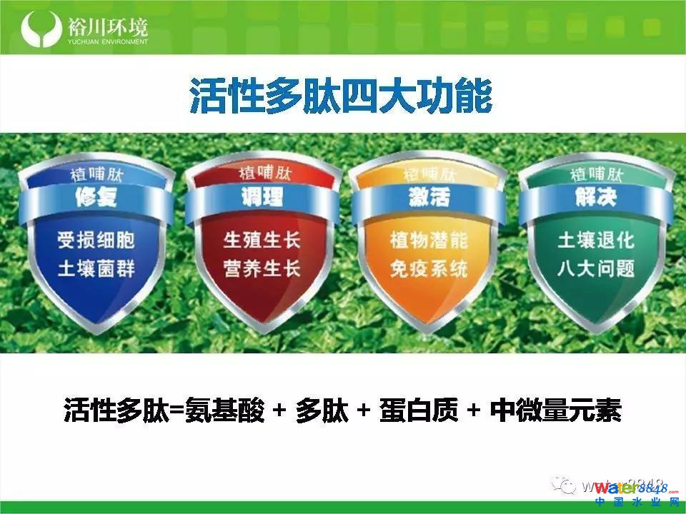 如何做出好產(chǎn)品?大家知道,我們要強有力的技術(shù)支持,裕川在發(fā)展之初就借鑒了國內(nèi)外的大學(xué)的研究成果,終于走出自我發(fā)展之路。我們在天津濱海新區(qū)日處理400噸污泥處置項目,我們的系統(tǒng)非常簡單。經(jīng)過裕川水解工藝破壁之后的微生物細(xì)胞最重要的成分是微生物蛋白,是就是活性多肽,它是從動植物和微生物提取的分子量小于2000道爾頓活性多肽,通過鰲合和復(fù)配作用生成液體的活性多肽的有機肥。核心功能是修復(fù)受損細(xì)胞,給植物一個“修復(fù)精華液”,調(diào)節(jié)植物營養(yǎng)和生殖生長。營養(yǎng)生長很重要,氮磷鉀化肥就可以了,但是生殖生長一定要有正確的基因表達(dá),而裕川的多肽產(chǎn)品就是作為一個“運養(yǎng)快車”向植物傳達(dá)非常正確的基因表達(dá),激活植物的免疫系統(tǒng)。大家知道為什么植物現(xiàn)在容易生。恳驗槊庖呦到y(tǒng)被破壞了。如果我們只吃饅頭和米飯身體也受不了,我們的活性多肽產(chǎn)品可以給植物補充他的免疫力,同時解決土壤退化的八大問題。