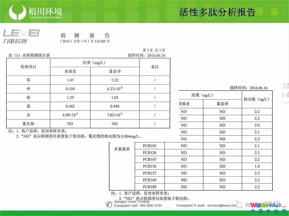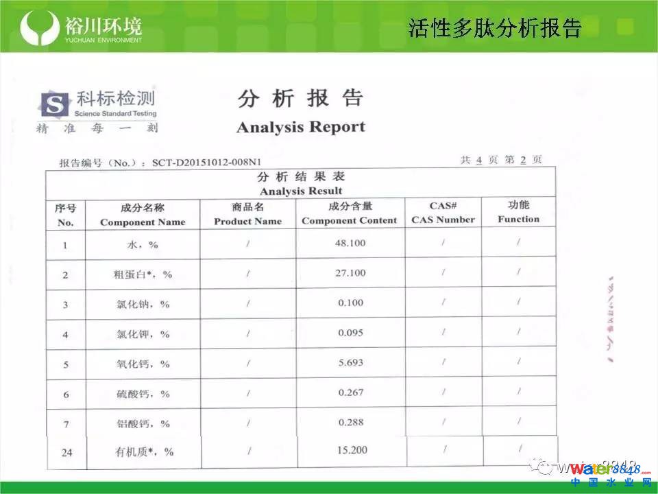活性多肽產(chǎn)品,目前是裕川這種水解工藝能夠從微生物細(xì)胞里面提出來,成分是氨基酸,加多肽、蛋白質(zhì)、中微量元素,可以鰲合的營養(yǎng)元素,相當(dāng)于一次解決所有的土壤問題。我們也做了分析報告,在活性多肽蛋白液里面的重金屬要比國家的食品類的重金屬、飼料級的重金屬,還要低2個數(shù)量級。同時,我們的活性多肽通過了多氯聯(lián)苯和多環(huán)芳烴等的檢測,沒有任何的有害物質(zhì),因為它是細(xì)胞中的一種提取物。對活性多肽我們做了一次非常細(xì)致的分子量的檢測,證明它富含18種氨基酸,而每種氨基酸都為植物提供非常好的營養(yǎng)服務(wù),實現(xiàn)植物遺傳基因的正確表達(dá),最終才能夠?qū)崿F(xiàn)增產(chǎn)增收提質(zhì)。