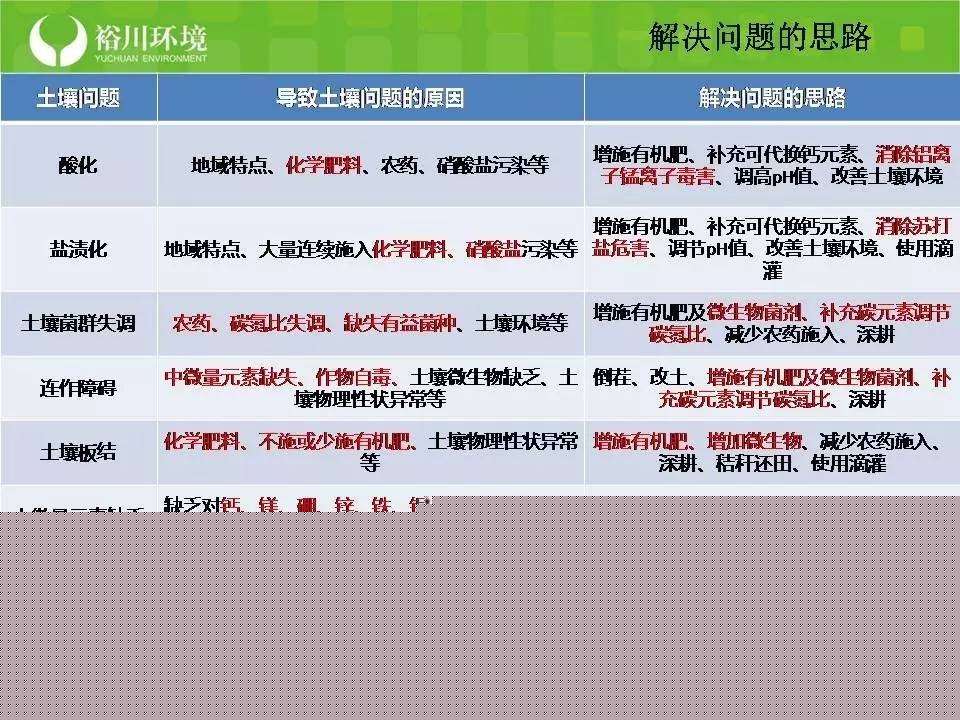這里放映一些照片,我們看到的土壤板結(jié)、酸化、營養(yǎng)失調(diào)、鹽漬化、土壤菌群失調(diào)、微量元素缺乏、毒素積累等;沒有健康的土壤怎么能種出來健康的食品呢?所以大家可以看到,導(dǎo)致土壤問題的原因,解決問題的思路,無論是酸化、鹽漬化、菌群失調(diào)、連作障礙、土壤板結(jié),所有的問題里面非常重要的一條:就是化肥、農(nóng)藥是最大的殺手之一,當(dāng)然還有我們不惜一切代價的過度耕作方式等;解決問題的所有思路,都是要會涉及:有機肥、微量元素、微生物菌劑,就是要給土壤供應(yīng)“健康的食品”,土壤才能以健康的農(nóng)產(chǎn)品來滋養(yǎng)人類,人類才能夠健康繁衍、不斷發(fā)展。