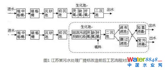 該污水廠處理規(guī)模為20萬m3/d,原工藝為A2/O,出水標(biāo)準(zhǔn)為一級B。改造工藝為改良A2/O(填料)+膜過濾或濾布濾池,出水標(biāo)準(zhǔn)為一級A。改造前后工藝流程詳見圖1。