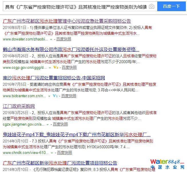 在清遠(yuǎn)市區(qū)污水處理廠污泥處置外包服務(wù)項(xiàng)目公開招標(biāo)公告文件中,對(duì)供應(yīng)商資格有如下規(guī)定:具有《廣東省嚴(yán)控廢物處理許可證》且其核準(zhǔn)處理嚴(yán)控廢物類別為城鎮(zhèn)集中式生活污水處理廠產(chǎn)生的污水處理污泥(HY06)。據(jù)查,該條款在“獅嶺鎮(zhèn)污水處理廠污泥處置項(xiàng)目”等污泥項(xiàng)目中均有提及。事實(shí)上,在某度中搜索“具有《廣東省嚴(yán)控廢物處理許可證》且其核準(zhǔn)處理嚴(yán)控廢物類別為城鎮(zhèn)集中式生活污水處理廠產(chǎn)生的污水處理污泥”,能夠找到近年內(nèi)的多項(xiàng)廣東省內(nèi)污泥處理項(xiàng)目招標(biāo)文件。