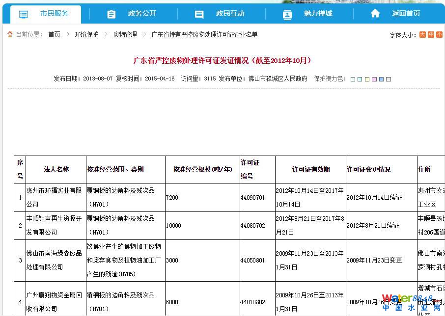 據(jù)官方網(wǎng)站公布的“廣東省嚴(yán)控廢物處理許可證發(fā)證情況(截至2012年10月)”信息顯示,當(dāng)時(shí)擁有該許可證的只有49家廣東省內(nèi)企業(yè),類別為“城鎮(zhèn)集中式生活污水處理廠產(chǎn)生的污水處理污泥( HY06)”的企業(yè)只有7家。