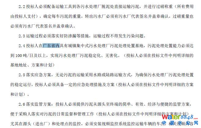 而在作為附件的PDF版招標(biāo)文件中,則明文顯示:“投標(biāo)人在廣東省內(nèi)具有城鎮(zhèn)集中式污水處理廠污泥處理處置基地,污泥處理處置能力必須達(dá)到100 噸/日及以上,實(shí)現(xiàn)污水處理廠污泥穩(wěn)定化、無害化。(投標(biāo)人必須在投標(biāo)文件中列明詳細(xì)的基地地址、方案和計(jì)劃)”。