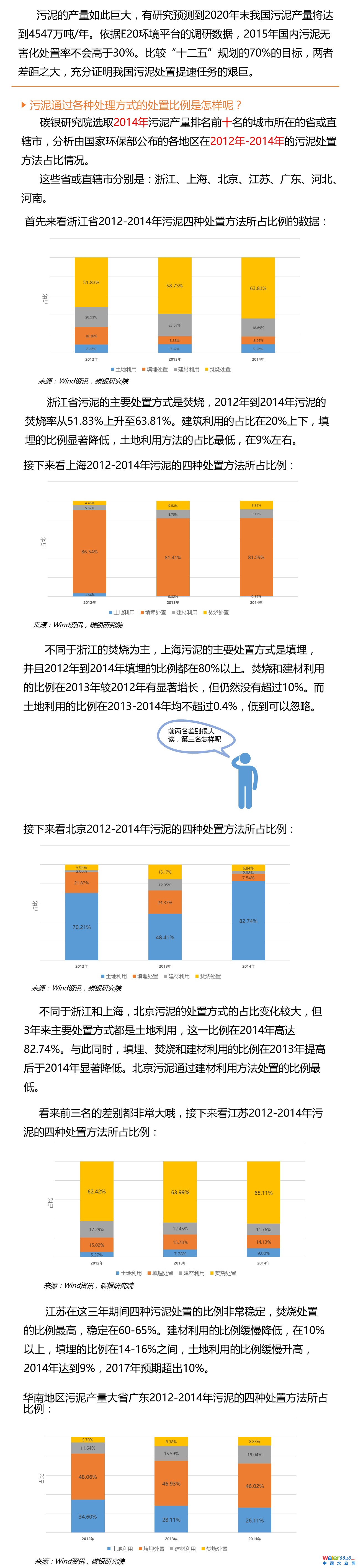 碳銀研究院整理了國內(nèi)113個(gè)重點(diǎn)城市(包括直轄市、省會(huì)城市、大多數(shù)二線、三線城市)從2002年到2014年所有記載的污泥年產(chǎn)量,并選取2014年污泥產(chǎn)量排名前十名的城市所在的省或直轄市,分析由國家環(huán)保部公布的各地區(qū)在2012年-2014年的污泥處置方法占比情況。