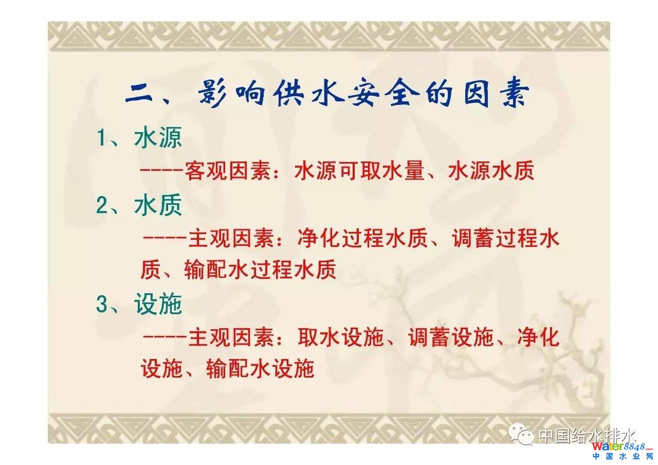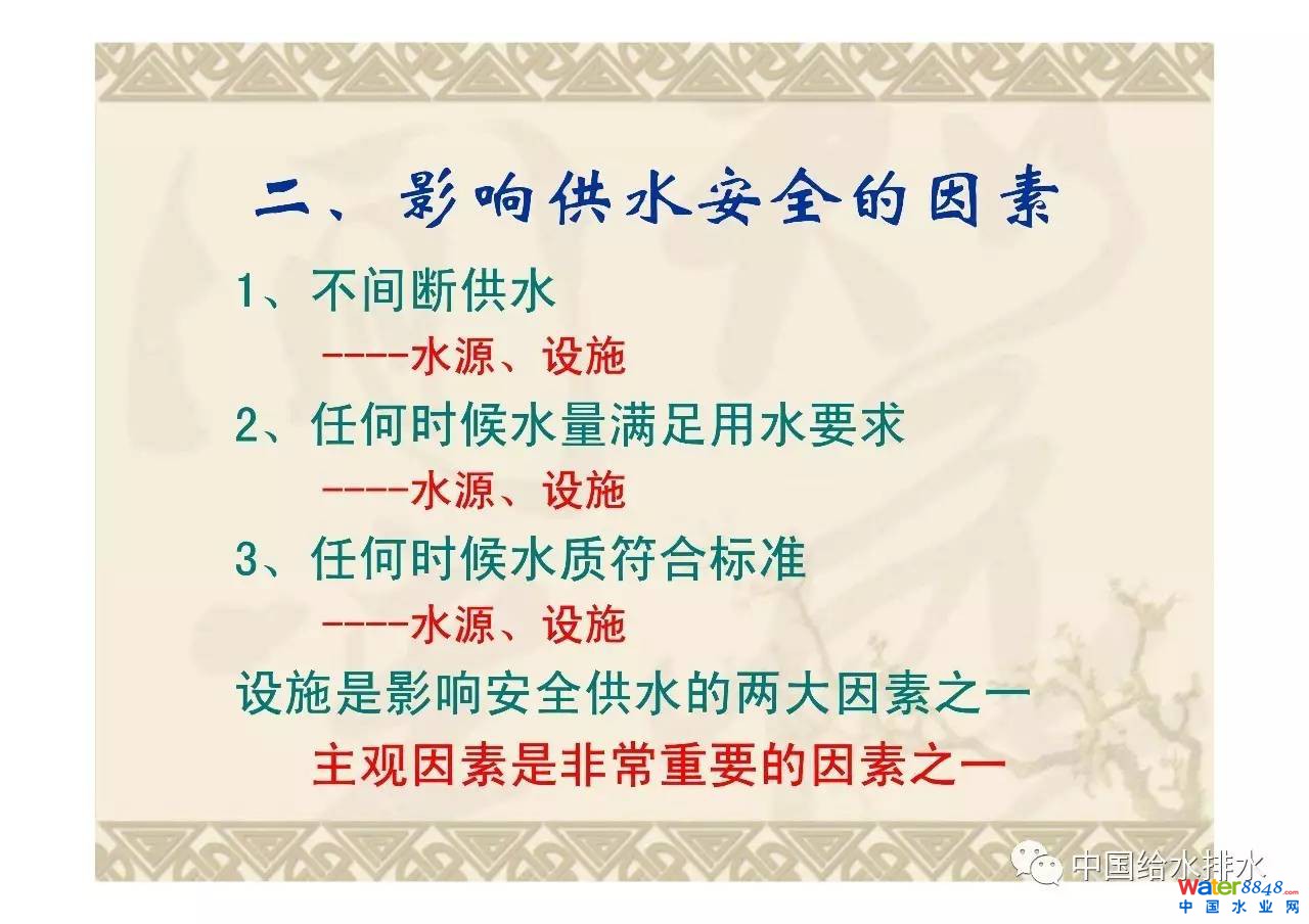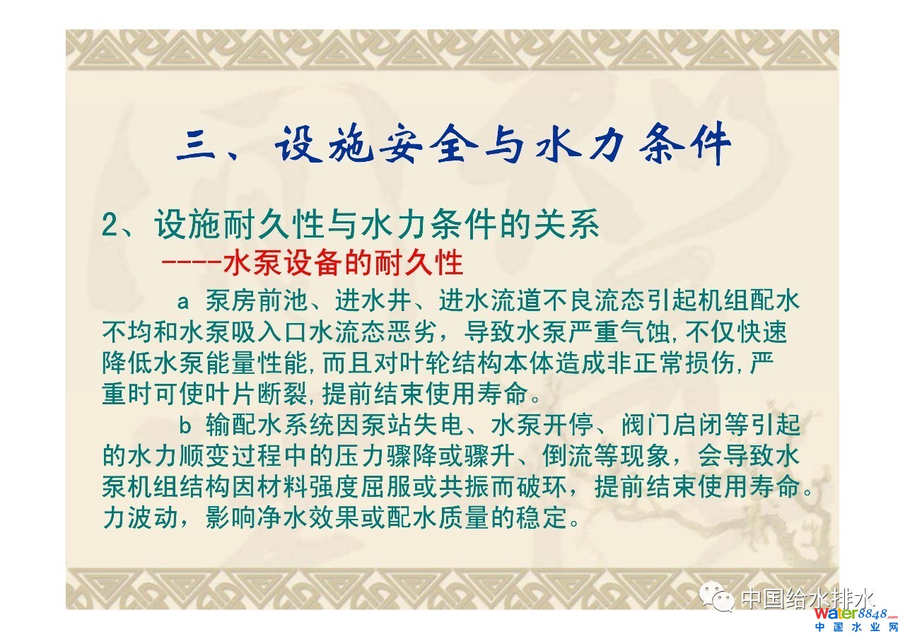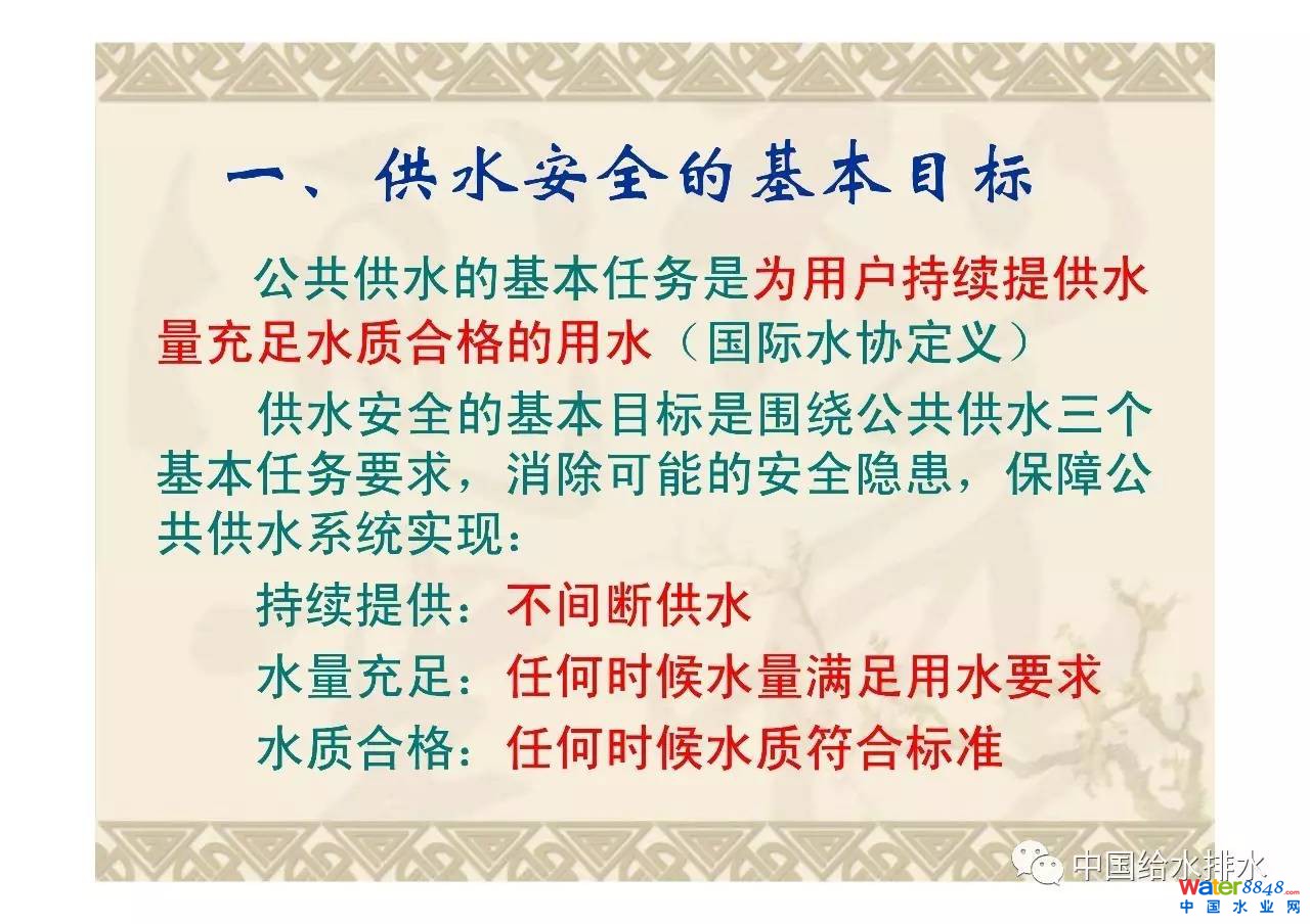 公共供水的基本任務(wù)是為用戶持續(xù)提供水量充足、水質(zhì)合格的用水,供水安全的基本目標(biāo)是圍繞公共供水三個(gè)基本任務(wù)要求,消除可能的安全隱患,保障公共供水系統(tǒng)實(shí)現(xiàn)持續(xù)提供、水量充足、水質(zhì)合格。分析了影響供水安全的因素即水源、水質(zhì)和設(shè)施,指出了設(shè)施穩(wěn)定運(yùn)行與水力條件的關(guān)系,給出了水力優(yōu)化重點(diǎn)和對(duì)策。