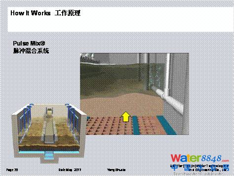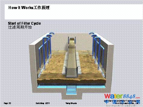 同時(shí)看一下濾池的結(jié)構(gòu),它實(shí)際上是一個(gè)非滿流的過(guò)濾,在承托層和清水層間有一層氣囊,在沙層上液位提升到一定的高度的時(shí)候,就會(huì)自動(dòng)啟動(dòng)脈沖攪拌,就是用清水壓著氣囊里面的氣自下而上的穿過(guò)承托層,穿過(guò)沙層,把沉積在沙層的污染物又反推到水層當(dāng)中,這樣把沙層上面的水層也作為一個(gè)納污層來(lái)利用從而保證正常過(guò)濾效果。