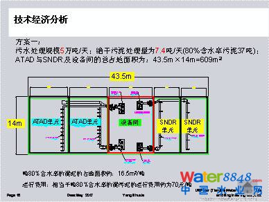 再來(lái)列舉一下國(guó)內(nèi)幾個(gè)典型的規(guī)模的一些參數(shù)。假設(shè)污水廠的基本處理規(guī)模是5萬(wàn)噸/d,含固率是20%的量,37噸的情況下,所用的面積是609平米,運(yùn)行費(fèi)用好氧消化+同步硝化反硝化70元/噸含水率80%的污泥。