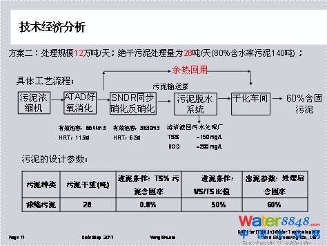 規(guī)模更大一些經(jīng)濟(jì)性更好一些。對(duì)于污泥規(guī)模為140噸/d的80%含水率的污泥,它的處理的一個(gè)全流程,它的處理對(duì)象是針對(duì)剩余污泥,含固率只有0.8%的活性污泥,經(jīng)過(guò)全流程的處理,最后要達(dá)到60%含固率的泥,從泥量平衡上來(lái)說(shuō),我處理的對(duì)象是從3500噸,最后降到32噸,總體上達(dá)到99%以上的減容效果,它的一些經(jīng)濟(jì)參數(shù)是這樣的。運(yùn)行費(fèi)用是55元每噸80%含水率的污泥,這個(gè)全流程是從濃縮開始,一直到預(yù)熱回收利用之后達(dá)到60%含固率的泥,總的運(yùn)行費(fèi)用是150元每噸80%含水率的污泥。而設(shè)備的參數(shù)供大家參考一下,具體項(xiàng)目參數(shù)還需具體分析。