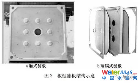根據(jù)濾板組的組成不同,現(xiàn)今市政污泥處理行業(yè)主流的板框壓濾機(jī)可分為兩種形式:普通廂式板框壓濾機(jī)和隔膜板框壓濾機(jī)。普通廂式板框壓濾機(jī)的濾腔由兩塊普通廂式板組合而成,隔膜板框壓濾機(jī)由普通廂板和隔膜板共同組成,如圖2所示。隔膜式板框壓濾機(jī)進(jìn)泥后,則利用壓榨水泵向壓濾機(jī)隔膜板中注入高壓水,利用隔膜張力對(duì)污泥進(jìn)行進(jìn)一步擠壓脫水。板框壓濾機(jī)濾液透過濾布排出,固體物質(zhì)被濾布阻隔,形成含水率較低的干物質(zhì)。隔膜式板框壓濾機(jī)出泥含水率低,運(yùn)行循環(huán)周期相對(duì)較短,故本工程采用隔膜式板框壓濾機(jī)。