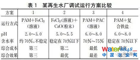 現(xiàn)況運(yùn)行的板框脫水機(jī)房在運(yùn)行調(diào)試期間,分別對(duì)不同種類的絮凝劑做了進(jìn)泥調(diào)質(zhì)試驗(yàn),結(jié)果見表1。在同樣的調(diào)質(zhì)時(shí)間、調(diào)質(zhì)溫度及相近進(jìn)泥有機(jī)質(zhì)含量的條件下,出泥泥餅含水率穩(wěn)定在70%以下的分別為:方案2——FeCl3(溶液)+CaO(粉末)及方案4——PAM+復(fù)合鐵鹽。投加PAM+復(fù)合鐵鹽的綜合成本最高,導(dǎo)致運(yùn)行費(fèi)用大幅增加。而投加FeCl3(溶液)+CaO(粉末)擁有較好的出泥效果、適當(dāng)?shù)乃釅A度及較經(jīng)濟(jì)的運(yùn)行費(fèi)用,成為綜合效果最優(yōu)的運(yùn)行方式。