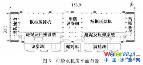 槐房板框脫水機(jī)房東西兩側(cè)各設(shè)有8臺(tái)隔膜式板框壓濾機(jī),共16臺(tái)(16 t/d,過濾面積800 m²),13用3備。板框機(jī)南側(cè)為16組高低壓進(jìn)泥泵組(東西兩側(cè)各8組)(低壓進(jìn)泥泵Q=120 m³/h,H=0.6 MPa, 高壓進(jìn)泥泵Q=40 m³/h,H=1.2 MPa,壓榨水池有效容積79 m³)及2套壓榨系統(tǒng)(東西兩側(cè)各1套),(壓榨水泵Q=16 m³/h,H=2.2 MPa)。機(jī)房中部為附屬設(shè)備間,內(nèi)設(shè)鐵鹽加藥系統(tǒng)(12臺(tái)加藥泵,東西側(cè)各6臺(tái),Q=20 m³/h,H=20 m)、沖洗水系統(tǒng)2套(每套含3臺(tái)沖洗泵,及1個(gè)沖洗水箱,Q=250 L/min,H=6 MPa,水箱V=10 m³)及PAM加藥系統(tǒng)(溶液制備量7 500 L/h,濃度5‰)。機(jī)房外南側(cè),分別設(shè)有12座進(jìn)泥調(diào)質(zhì)池,2座調(diào)理藥劑儲(chǔ)藥池。