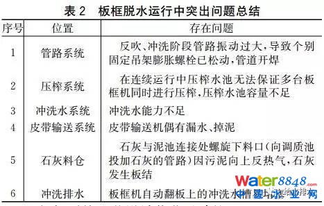 隨著北京城區(qū)“污泥處理三年計(jì)劃”的全面展開,板框脫水系統(tǒng)在幾處已經(jīng)建成投產(chǎn)的污泥處理廠試運(yùn)行中仍發(fā)現(xiàn)了一些問題。表2總結(jié)了板框脫水機(jī)房在調(diào)試運(yùn)行中出現(xiàn)的主要突出問題。