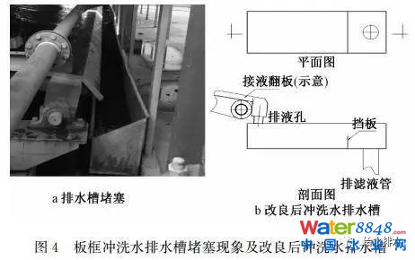 洗布廢水通常為泥水混合物,廢水進(jìn)入板框機(jī)自動(dòng)翻板上的沖洗水槽,容易造成排水管路堵塞,排水不暢(見圖4)。新建板框系統(tǒng)中,需在水槽處設(shè)簡(jiǎn)單的泥水分離裝置,以保證沖洗廢水的正常排放。