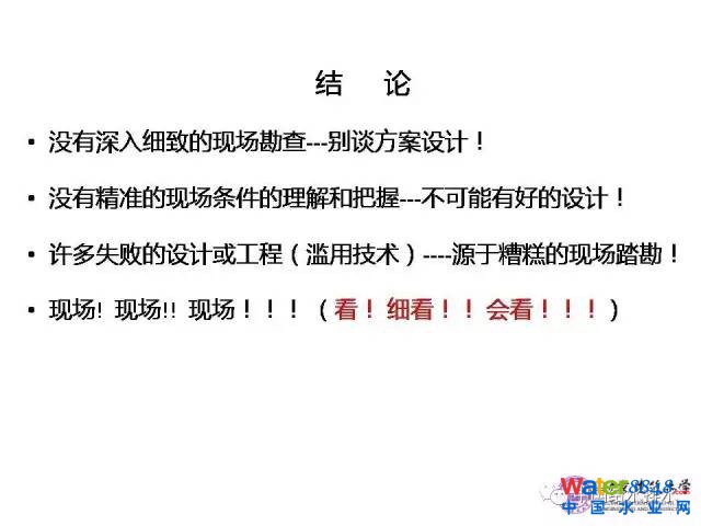 結(jié)論:第一,沒有深入細(xì)致的現(xiàn)場勘查,就不要談方案設(shè)計;第二,沒有精準(zhǔn)的現(xiàn)場條件的理解和把握,也不可能有好的設(shè)計;第三,今年很多教訓(xùn)和許多失敗的設(shè)計或工程(濫用技術(shù)),都是源于糟糕的現(xiàn)場踏勘;第四,現(xiàn)場!現(xiàn)場!還是現(xiàn)場!看現(xiàn)場還要細(xì)看、會看!
