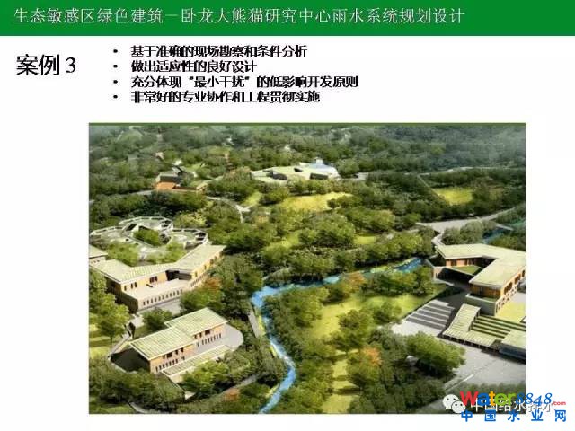 案例3:四川地震災(zāi)害有兩個援建項目,一個是臥龍大熊貓養(yǎng)殖基地,要按照三星的標(biāo)準(zhǔn)來做,二是都江堰大熊貓的疾控中心,委托我們來做方案。這里是一個完全自然生態(tài)的區(qū)域,在這樣的區(qū)域做這樣項目的開發(fā),思路一定不能照本宣科,一定不能這樣做,要犯錯誤。另外,上面有一個很大的沖溝,但是景觀人員到現(xiàn)場去看,河溝不好看,要做景觀的處理,甚至填掉重新弄,太深了。大家注意,以后搞場地開發(fā)的一定要注意保護坑坑洼洼的場地,那是我們的動脈、靜脈、毛細(xì)血管,那些毛細(xì)血管破壞了一定會遭到報應(yīng)。場地破壞非常大。當(dāng)時那里有一個小洼地,設(shè)置成一個水池。原來的工程設(shè)計師想在這里做管道,我說這么好的生態(tài)區(qū)域和這么好的地形,為什么埋雨水管道,大家千萬不要以為套了規(guī)范就是對的,不對,這里完全可以用自然的坡度。關(guān)于沖溝,我們調(diào)研的時候會問當(dāng)?shù)乩先舜迕瘢@個沖溝在暴雨的時候是什么狀況,老人會告訴我們有很深的水,是一個行洪的通道。最后不僅僅拿到了綠色建筑的三星設(shè)計標(biāo)識,經(jīng)過運行以后,一年前拿到了運行標(biāo)識。專業(yè)之間的配合,這兩家全面做,我們僅僅做水系方案而已,我們很好地融合到他們的總體方案中。另外,施工圖設(shè)計是四川水院,做了非常好的配合。把我們的理念貫穿到里面,可能細(xì)節(jié)有一些改變,根本沒有用人工化的設(shè)施。