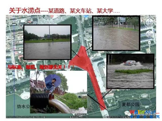 下一個案例,關(guān)于水澇城市的案例非常多,只講一個,也是十多年做的,延慶規(guī)劃局委托我們做規(guī)劃,比較超前,還不是真正的規(guī)劃,類似于今天做的海綿城市專項規(guī)劃。但是我們在現(xiàn)場調(diào)研檢查就碰到了一場很大的暴雨。在這條交鋒干道上全部癱瘓,大家可以在現(xiàn)場看到,離河邊不到10米,有200~300米的落差,這么高的落差,這個地方嚴(yán)重的積水癱瘓了幾個小時,這樣的水澇在很多城市都碰到了。這樣的水澇點第一不是規(guī)劃問題,第二不是標(biāo)準(zhǔn)問題,第三不是規(guī)范問題。這樣的案例在別的城市,一個新建的火車站在暴雨中淹得非常厲害,設(shè)施全部淹了,當(dāng)?shù)氐囊?guī)劃設(shè)計人員往現(xiàn)場去看,一個新建的火車站外面有一個很大的廣場,那個大的廣場沒有排水、很平,廣場的水全部涌到地下去了,地下的口是一個開放的,有一排好像排水的壁紙,好像阻擋水進入到下面去。像擋水的壁紙為了好看,全是不銹鋼,不知道用什么方法加工很細(xì)的縫,我去看了說通不通,我拿名片插是不通的,說你們不要等規(guī)范規(guī)劃,馬上這個問題就解決了。