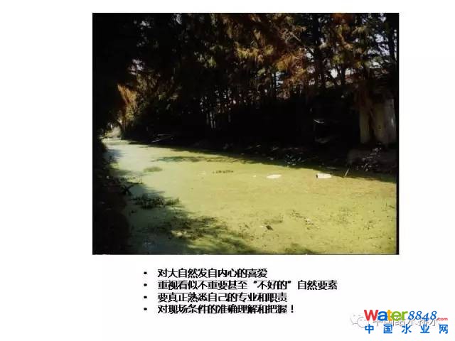 我回顧一下,我自己經(jīng)歷過的,這是十多年武漢的一個開發(fā)項目,這是一個很大的開發(fā)項目,新建的小區(qū),規(guī)劃已經(jīng)做完了就要實施。里面有一個200米的河道,幾百顆水杉,如果你是規(guī)劃怎么做?他的負(fù)責(zé)人工程師是我的同學(xué),他們請了三個在北京還有一定影響力的規(guī)劃公司來做方案,而且方案已經(jīng)經(jīng)過幾輪的討論就要實施。他們的方案里面,溝是要填掉的,兩排樹要砍掉。今天在座的任何一個技術(shù)人員不會干這樣的傻事,但是這是事實。這些非常有影響力的設(shè)計公司的規(guī)劃是什么呢?他們看到這個水很臭,不知道這個溝是一個行洪通道,他們的方案很亂。三個方案都是重新在小區(qū)里面規(guī)劃一個人工的通道,那個主線,軸線,講得花里胡哨。我去了,看到樹上非常多的鳥,很不客氣地跟他們講這是犯罪。我跟他們老總匯報,老總也很吃驚,跟他們說了設(shè)計人員要到現(xiàn)場看,為什么不去看?我這個同學(xué)也一定看過現(xiàn)場,他們的總經(jīng)理也一定到過現(xiàn)場,為什么會對這樣的要素?zé)o視?第一,我們對大自然要發(fā)自內(nèi)心的喜愛;第二,要非常注意細(xì)節(jié),看似不重要其實是非常要好的要素;另外,作為一個工程人員熟悉掌握自己專業(yè)的內(nèi)涵和職責(zé),這個非常重要,也就是對現(xiàn)場準(zhǔn)確把握。