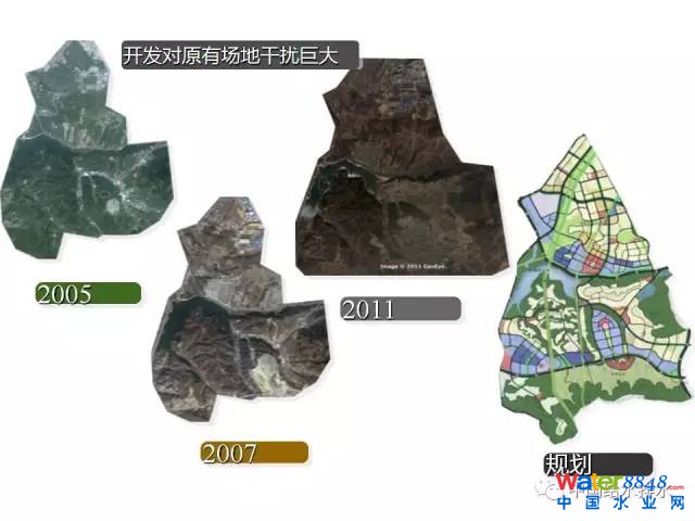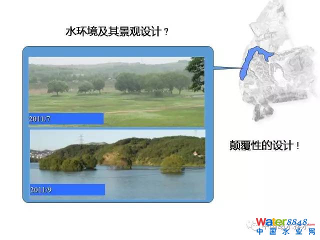 我當(dāng)時帶著這個研究生(趙楊)在做,明天他也有一個報告,這樣一個菜鳥從幾年時間變成今天有豐富經(jīng)驗的老總。當(dāng)時他不知道從哪里看,很遲鈍,今天在座有很多豐富的工程師也有一批菜鳥,是菜鳥不要緊,我們也是從菜鳥過來的。不是你有了理念,有了技術(shù),有了規(guī)劃,有標(biāo)準(zhǔn)就能做好一個項目,不是有項目就能有投資,不是的。我們現(xiàn)場做簡單的檢測。我們大量的方案都是在現(xiàn)場構(gòu)思的,不是在計算機上,不是在辦公室里面。而且有一個非常好的教訓(xùn),剛剛調(diào)研是第二次去了,第一次去談項目就注意到在項目的紅線之外,就在山頭看到了一個裸露的土地。我注意到了,腦子里面是一個疑問,第二次現(xiàn)場調(diào)查的時候翻過紅線外看嚇?biāo)廊,上面有一個部隊的采沙場,一下雨泥全部沖到湖里去,花了很多投資,包括新加坡這么好的景觀設(shè)計師設(shè)計了河道都會遭遇滅頂之災(zāi),設(shè)計人員包括當(dāng)?shù)氐墓芾砣藛T包括甲方都沒有注意到嗎?我們給甲方匯報,他們也嚇了一跳,就是在眼皮底下,唯獨就是在紅線外。
