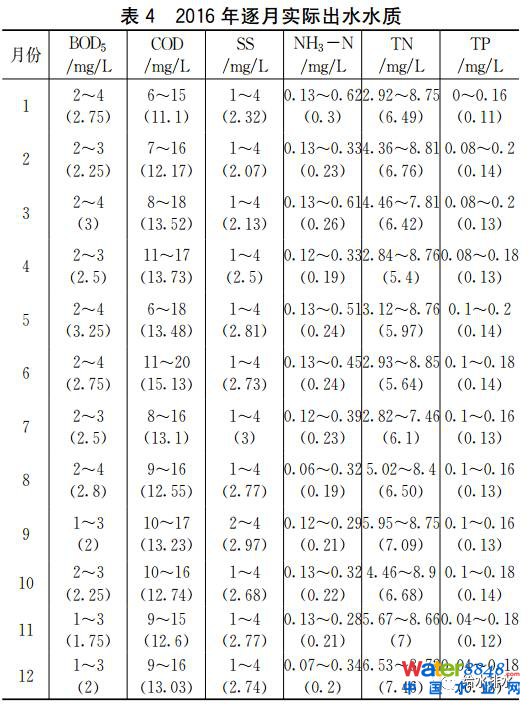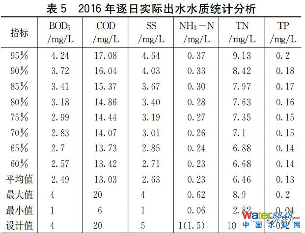 工程2016年逐月實(shí)際出水水質(zhì)見表4;對(duì)2016年逐日實(shí)際出水水質(zhì)進(jìn)行數(shù)理統(tǒng)計(jì)分析,結(jié)果見表5。