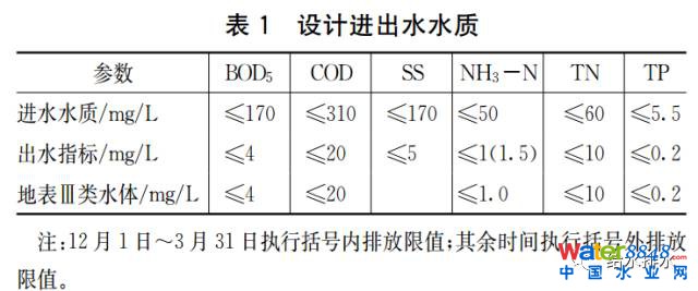 本工程設(shè)計(jì)中,對(duì)該廠一期工程近3年的進(jìn)水水質(zhì)進(jìn)行統(tǒng)計(jì)分析,同時(shí)結(jié)合現(xiàn)狀情況,既考慮到區(qū)域發(fā)展可能帶來的水質(zhì)變化,又避免因保證率取值過高而導(dǎo)致的處理設(shè)施和設(shè)備配置過大所造成的浪費(fèi),最終確定的進(jìn)出水水質(zhì)見表1。