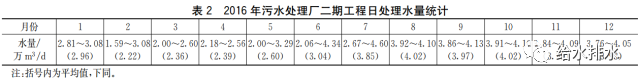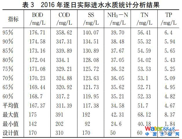 2016年該廠二期工程處理水量統(tǒng)計(jì)分析見表2,進(jìn)水水質(zhì)統(tǒng)計(jì)結(jié)果見表3。