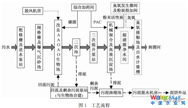 (3)深度處理工藝采用混凝+高密度沉淀池+超濾膜+臭氧工藝。該工藝集化學(xué)除磷、高效去除殘余SS和COD、脫色、消毒等多種功能于一體。