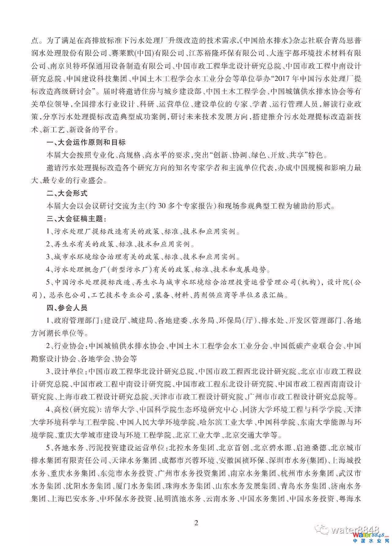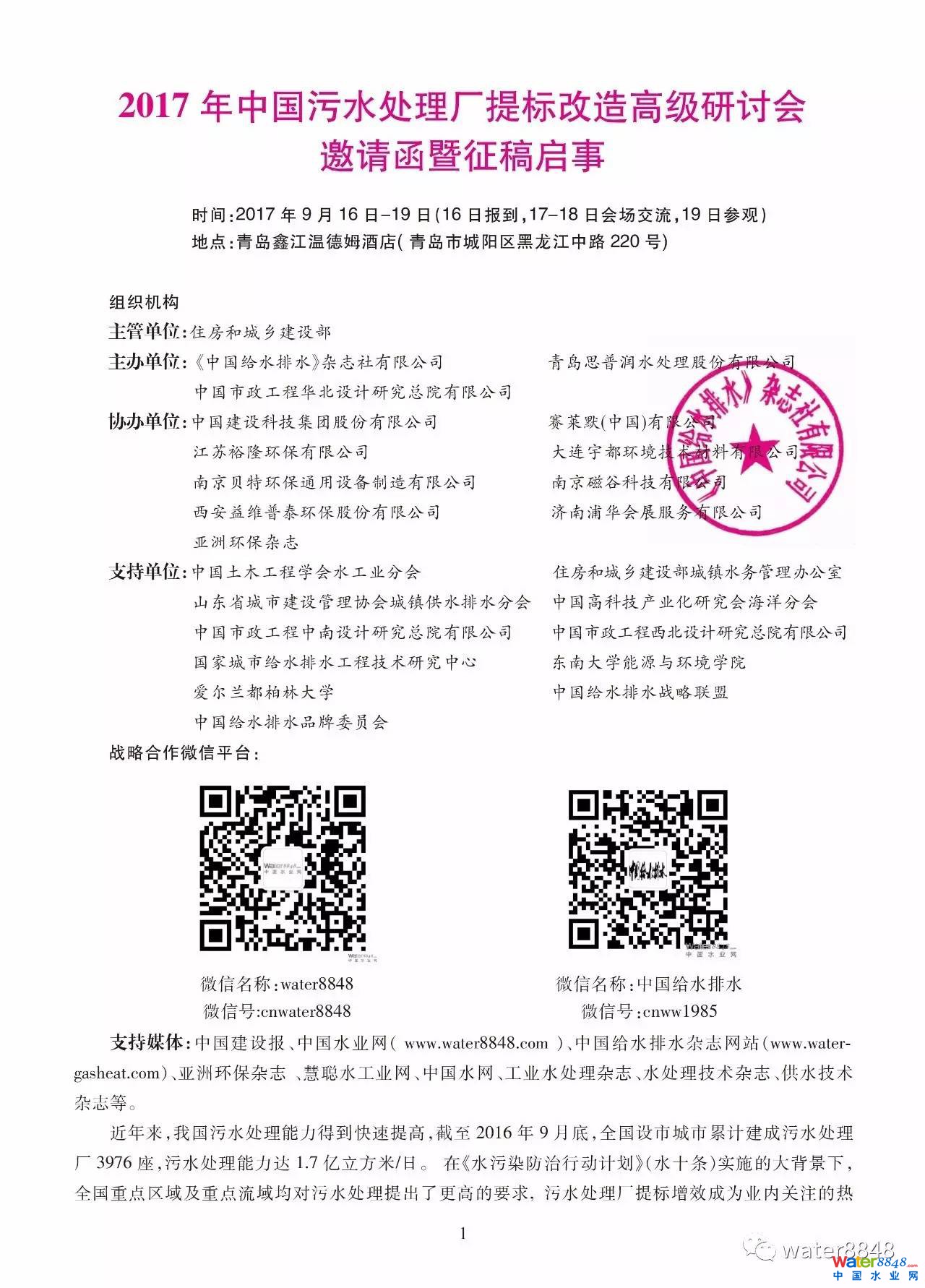 2017年中國污水處理廠提標改造高級研討會邀請函暨征稿啟事
