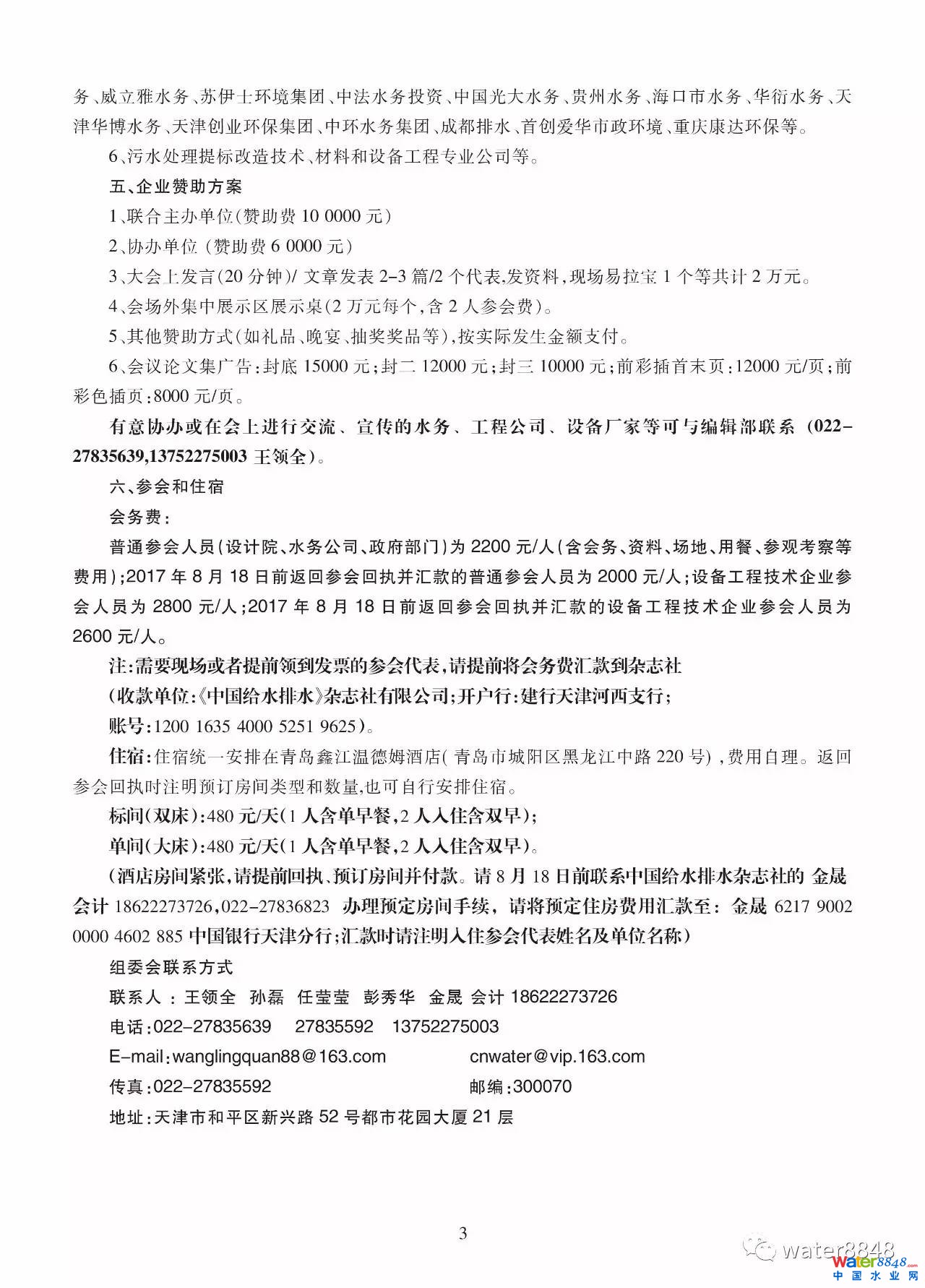 普通參會人員(設(shè)計院、水務公司、政府部門)為2200元/人(含會務、資料、場地、用餐、參觀考察等費用);2017年8月18日前返回參會回執(zhí)并匯款的普通參會人員為2000元/人;設(shè)備工程技術(shù)企業(yè)參會人員為2800元/人;2017年8月18日前返回參會回執(zhí)并匯款的設(shè)備工程技術(shù)企業(yè)參會人員為2600元/人。
