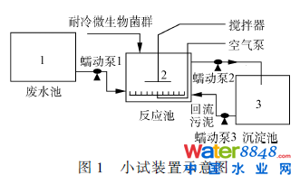 耐冷活性污泥污水處理能力評價自制小試裝置如圖1 所示,包括1 個空氣泵,3 個蠕動泵,體積均為4 L 的廢水池(裝人工污水)、反應池(裝活性污泥并進行曝氣) 和沉淀池(裝處理后的污水并可回流污泥)各1 個。