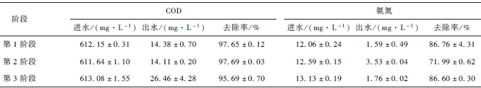 由表5 可知,達到穩(wěn)定時1 至2 階段的COD 去除率都維持在97% 左右,第3 階段維持在95% 左右;而氨氮的去除率除了在第2 階段時只有72% 左右以外,第1 和第3 階段都達到了86% 以上。