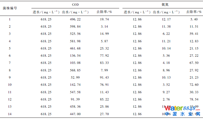 將分離出的14 種單菌株通過測定其5 ℃ 條件下的COD 和氨氮去除率來篩選目標菌株,表3 為處理5d 后的COD 和氨氮測定結果,綜合各菌株的COD 和氨氮的去除率可篩選出6 種優(yōu)勢菌株,即3 號、6 號、7號、9 號、10 號和12 號菌株。