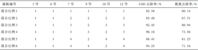 將篩選出來的6 種優(yōu)勢菌株按照表4 所列的6 種比例混合,測定其5 ℃ 條件下的COD 和氨氮去除率,表中列出了5 d 后各混合菌處理人工污水的COD 和氨氮去除率。實驗結果顯示混合比例3 和混合比例5 可同時保證COD 和氨氮的去除率都相對較高,本實驗最終依據(jù)混合比例3 進行菌株混合,然后將混合菌轉入人工污水培養(yǎng)以便后續(xù)實驗。