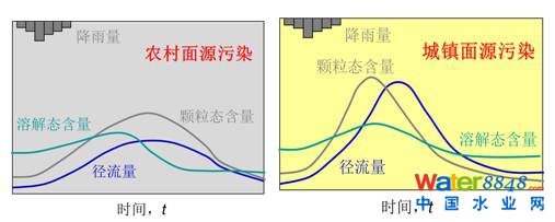 面源污染物的流失往往隨著降雨而發(fā)生,其污染特征為量大面廣、沖擊性強(qiáng)、來源復(fù)雜。通常,農(nóng)村與城鎮(zhèn)面源污染特征存在顯著差異,如城鎮(zhèn)面源污染物流失的峰值濃度高于農(nóng)村,且峰值的出現(xiàn)時間更早,這與城市的地表滯留作用更弱有關(guān)。面源污染物入河后,極易導(dǎo)致水體氮磷超標(biāo)而呈現(xiàn)富營養(yǎng)化,增加水華爆發(fā)風(fēng)險,并誘導(dǎo)產(chǎn)生一系列的負(fù)面生態(tài)效應(yīng)。