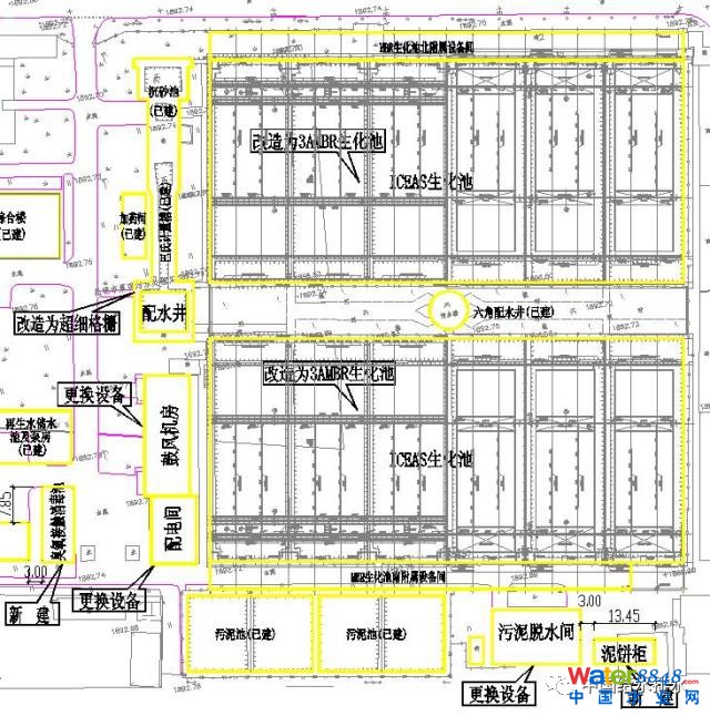 昆明四廠在升級(jí)改造過程中主要構(gòu)筑物沒有改變,最大限度地利用了原有構(gòu)筑物,將原ICEAS生化反應(yīng)池改造為MBR生反池及膜池,新建構(gòu)筑物只有污泥脫水泥餅柜,更多的是更換設(shè)備。