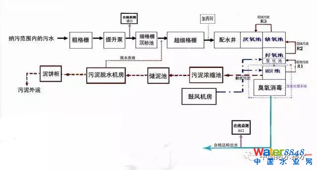 昆明四廠提標(biāo)升級(jí)改造以AAO+MBR工藝為核心,系統(tǒng)的配水、回流、曝氣流程可概括為:單點(diǎn)進(jìn)水、兩段好氧、三級(jí)回流,后置變化區(qū),MBR過濾出水。