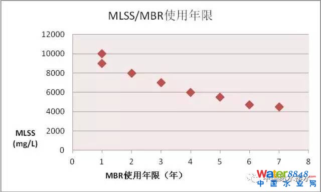 隨著膜使用年限的延長,則MLSS需要降低,以減緩膜污染,延長膜的使用壽命。TMP/ MLSS、TMP/ MBR產(chǎn)水量、MLSS/ MBR使用年限,它們之間呈非線性關(guān)聯(lián),在生產(chǎn)實(shí)際運(yùn)行中及膜清洗維護(hù)時(shí)應(yīng)予以重視。